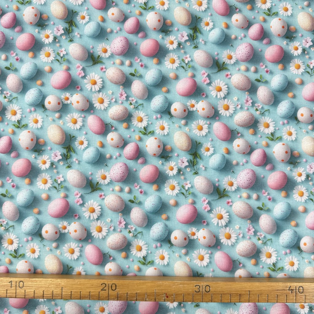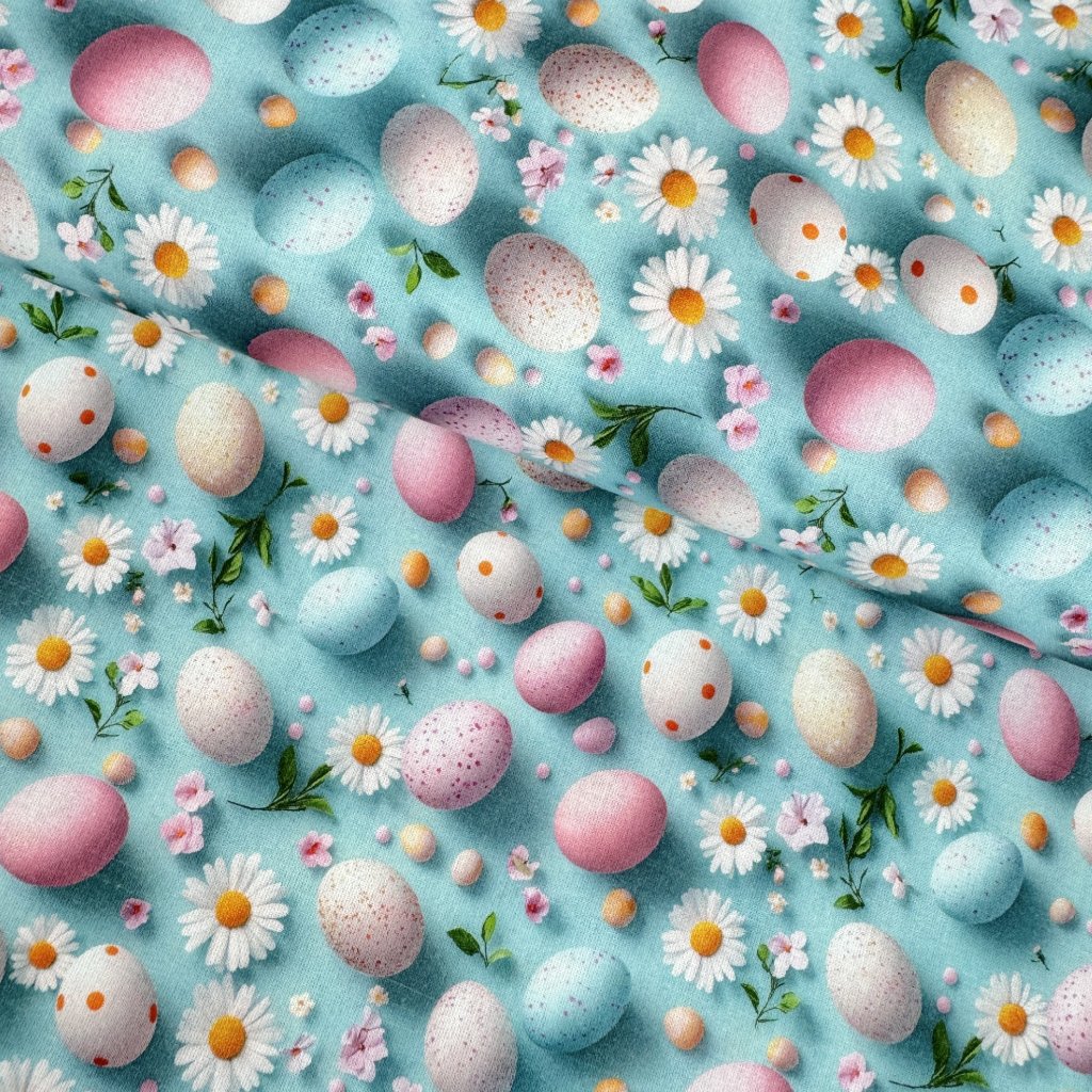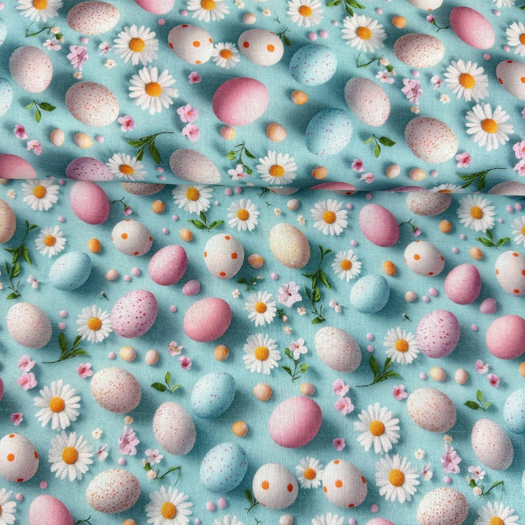 Bavlna digital - Vajíčka a sedmokrásky na modrom