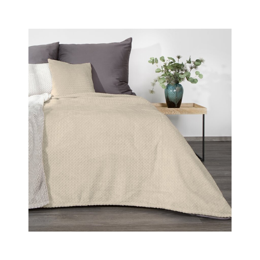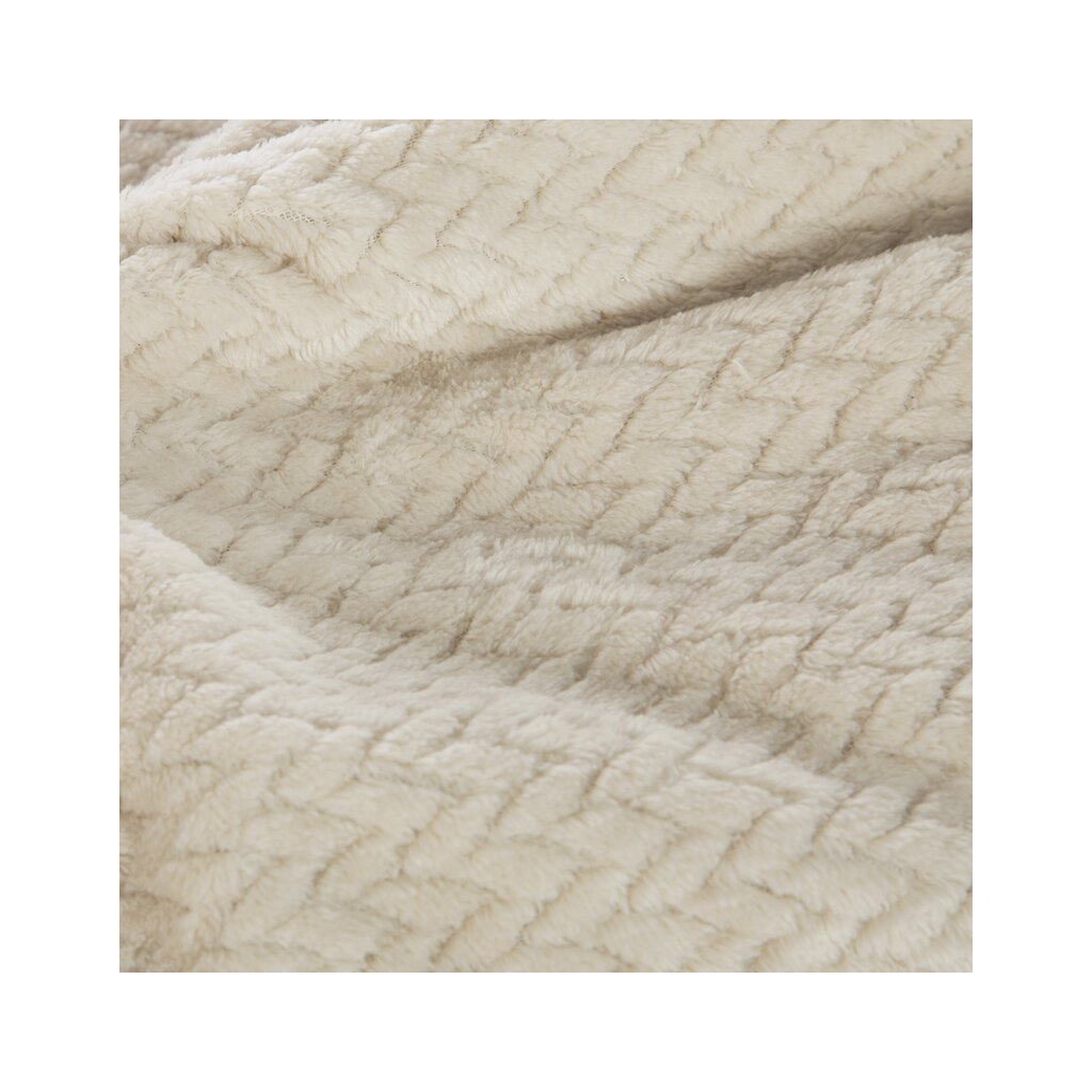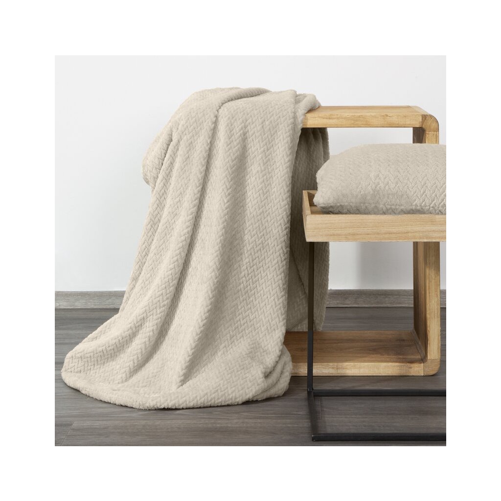 Klasická deka z príjemného vlákna v technológii mikroflano. Jednofarebná, nadýchaná štruktúra je zdobená minimalistickým reliéfnym vzorom v tvare rybej kosti.