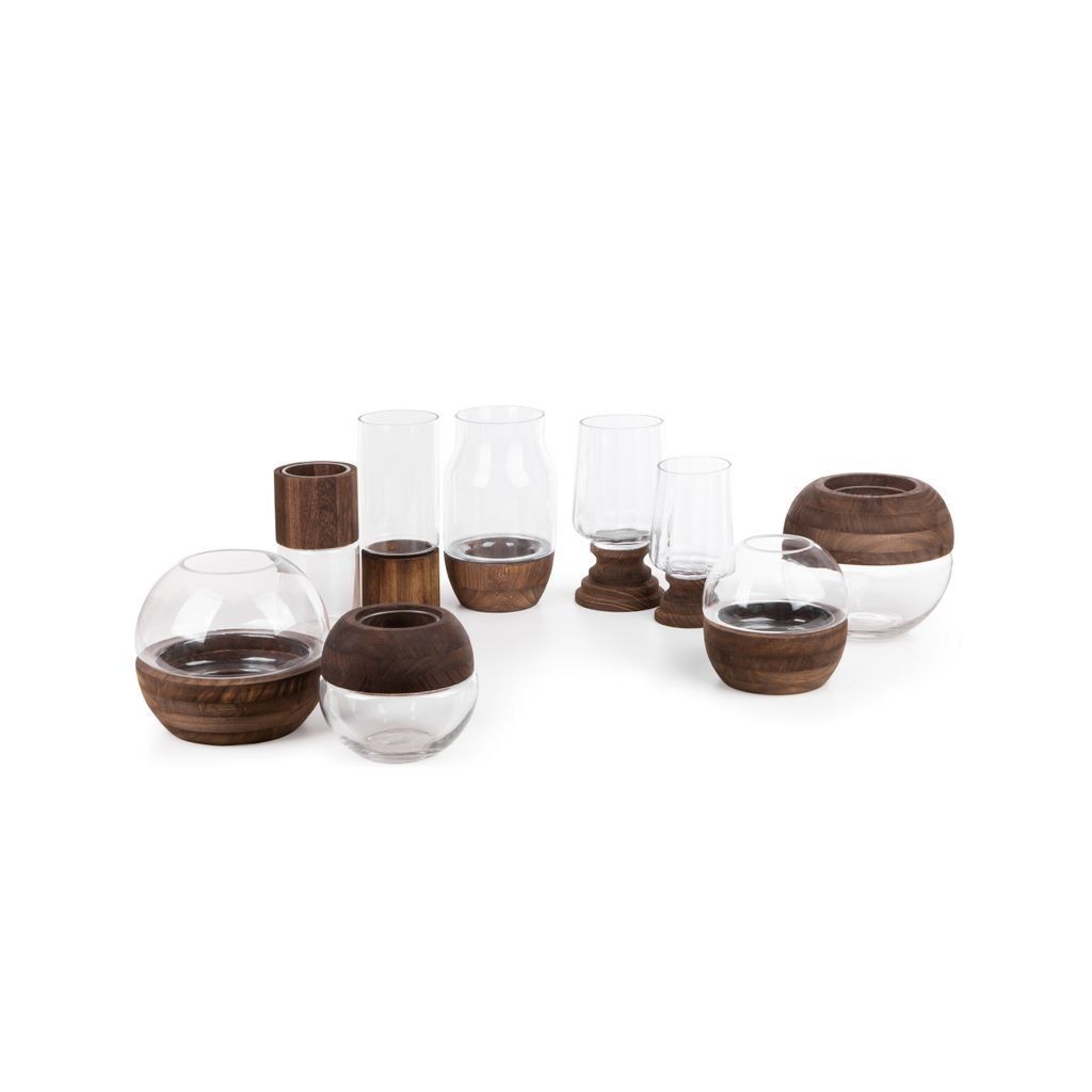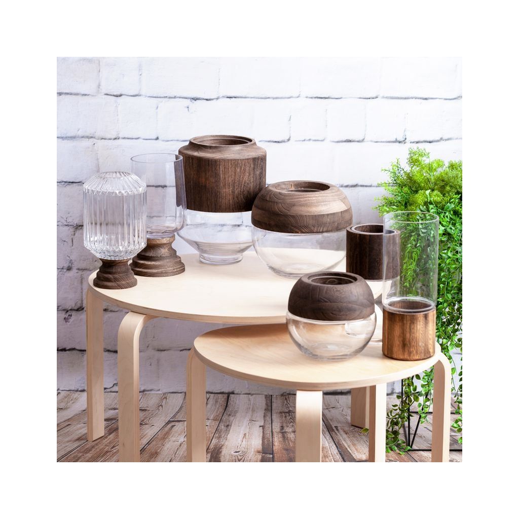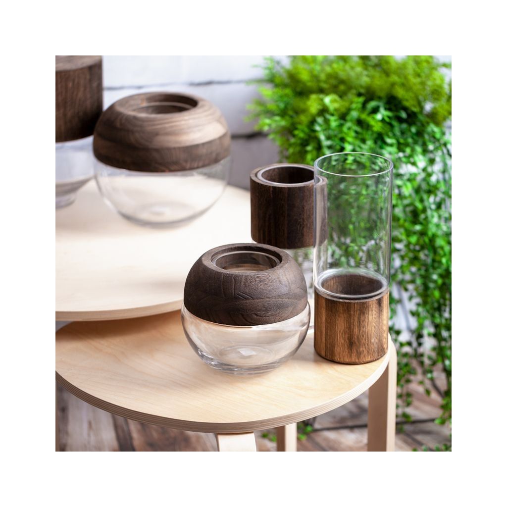 Dekoratívna váza šírka: (fi) 12 cm, dĺžka: 25 cm, farba: biela, zloženie: 70 % sklo; 30 % drevo