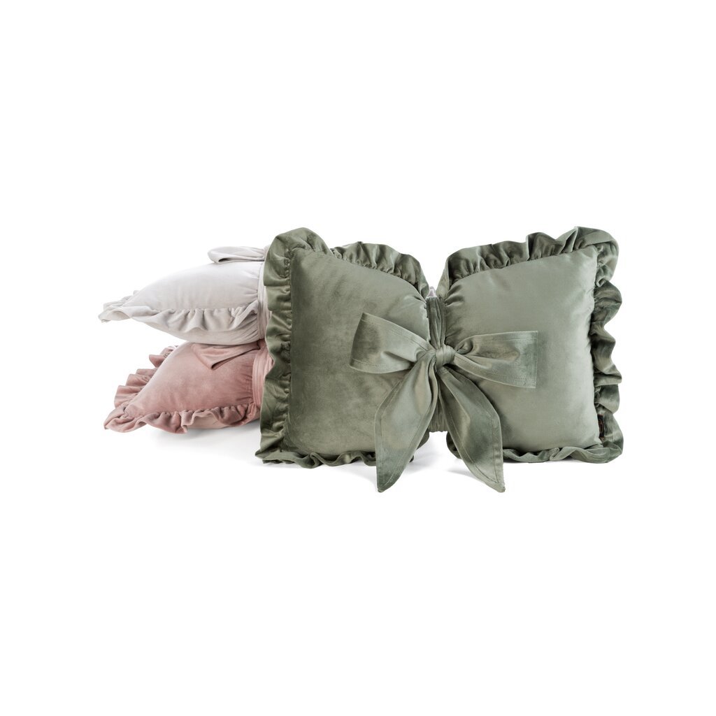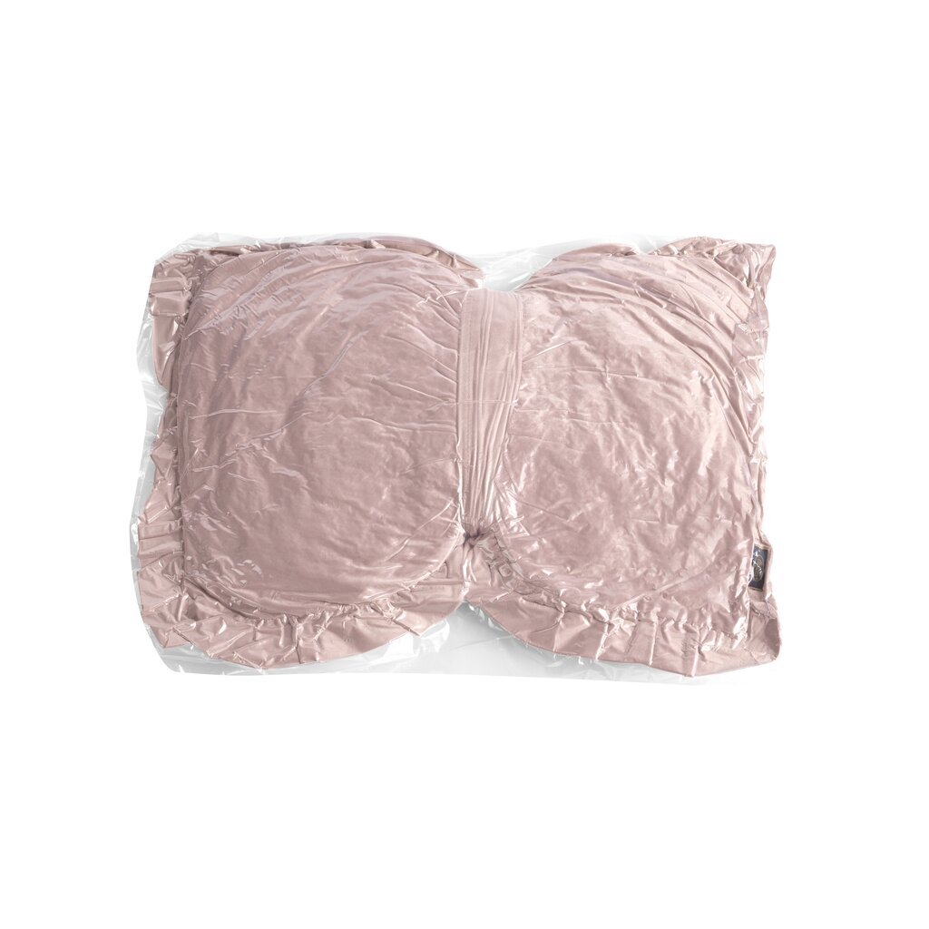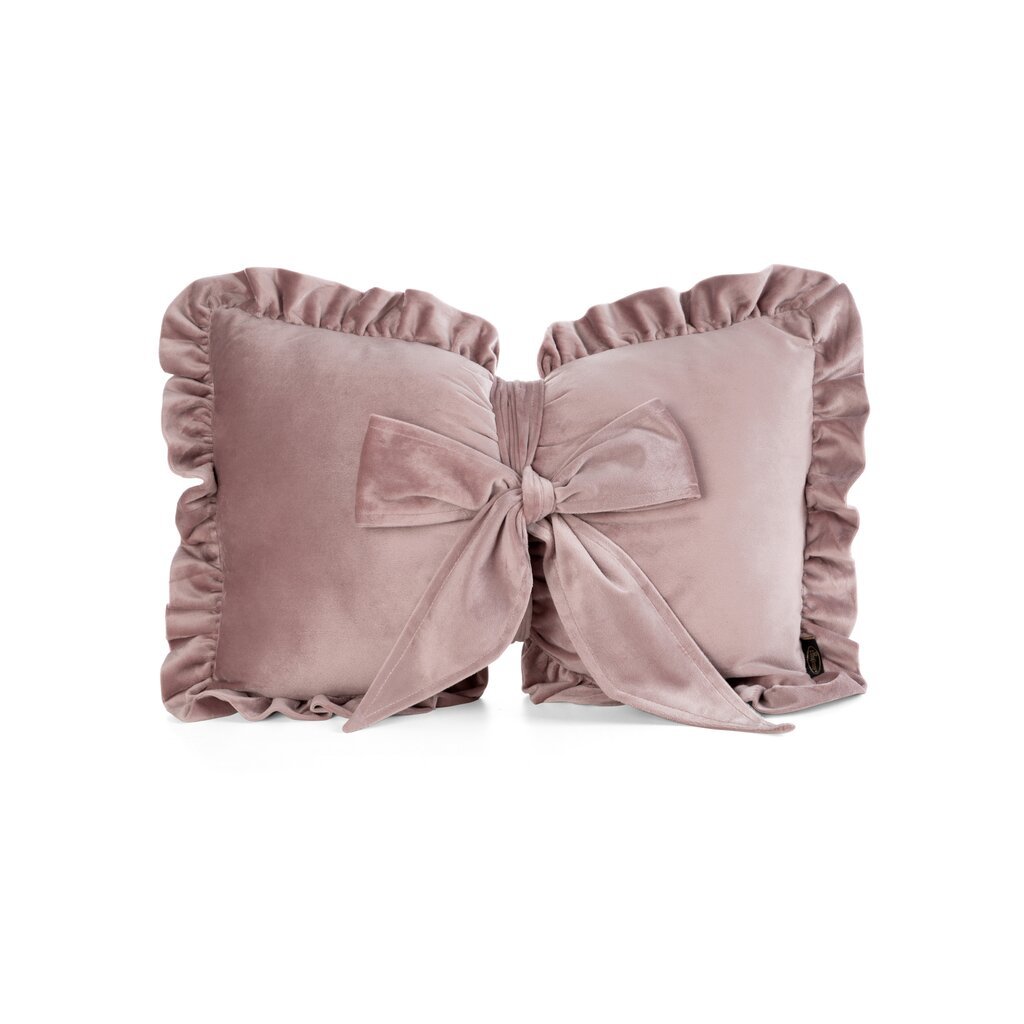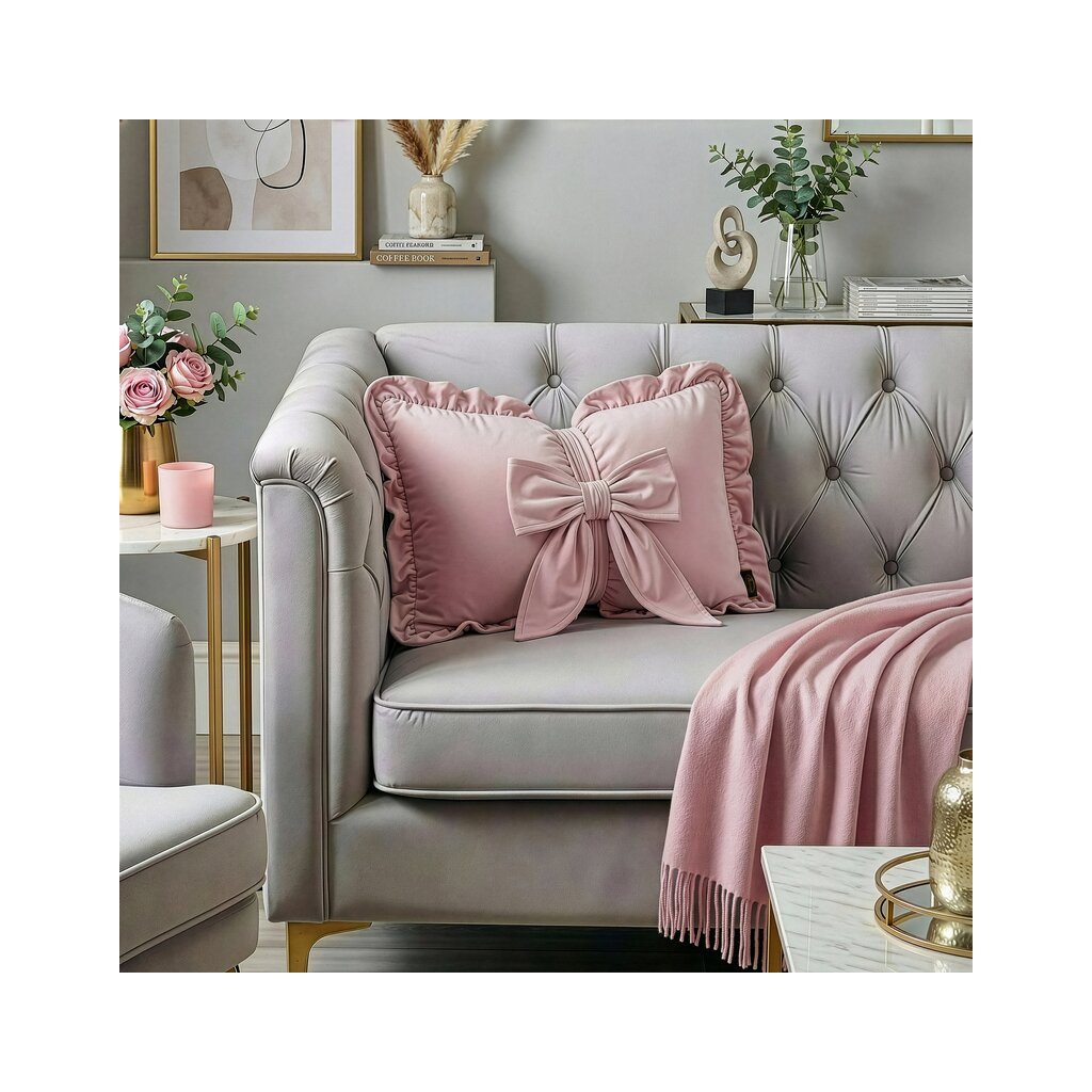 Velúrový vankúš s výplňou v tvare mašle, lemovaný volánom.