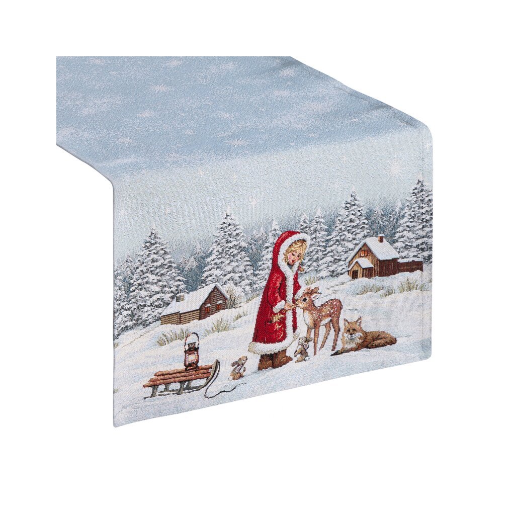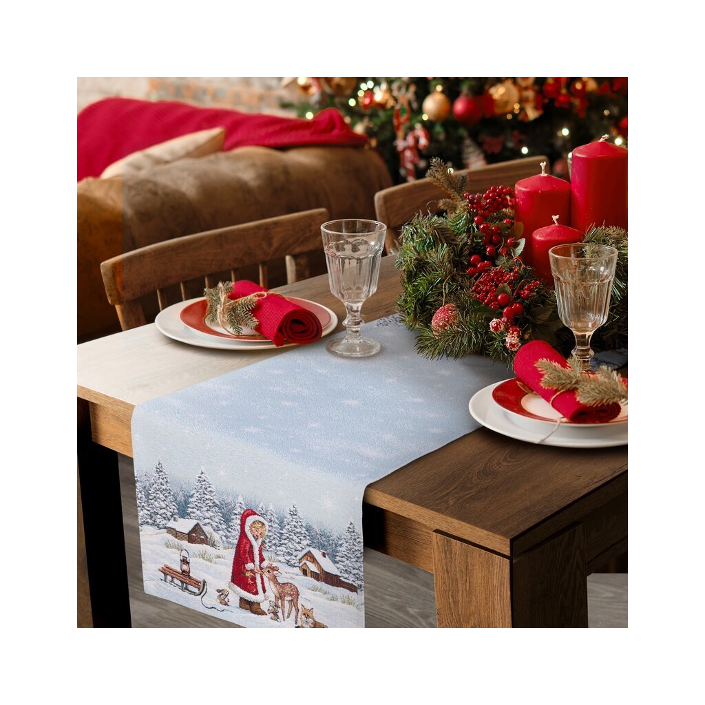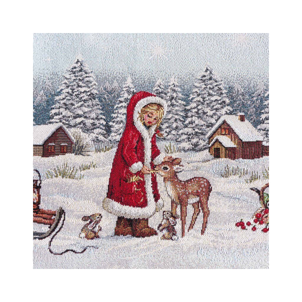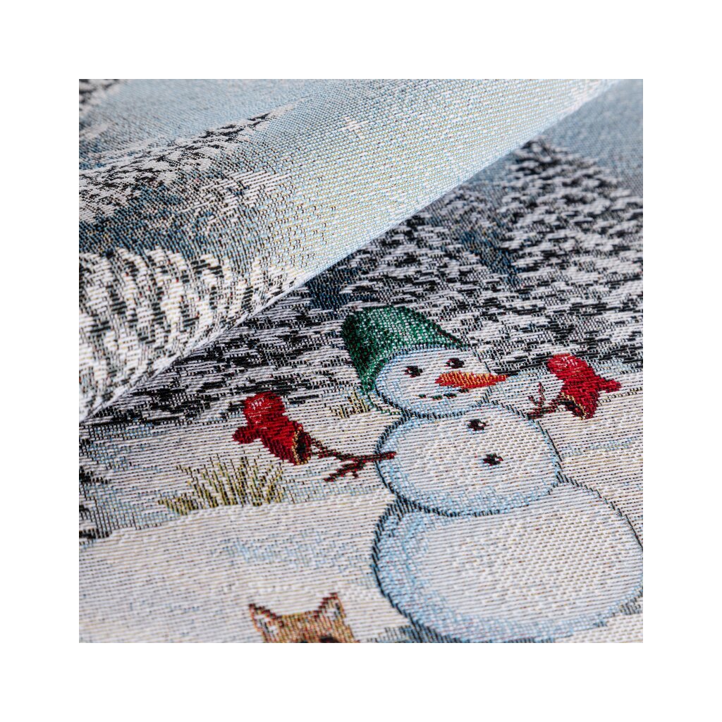 Obrus z gobelínovej tkaniny s vianočným vzorom.