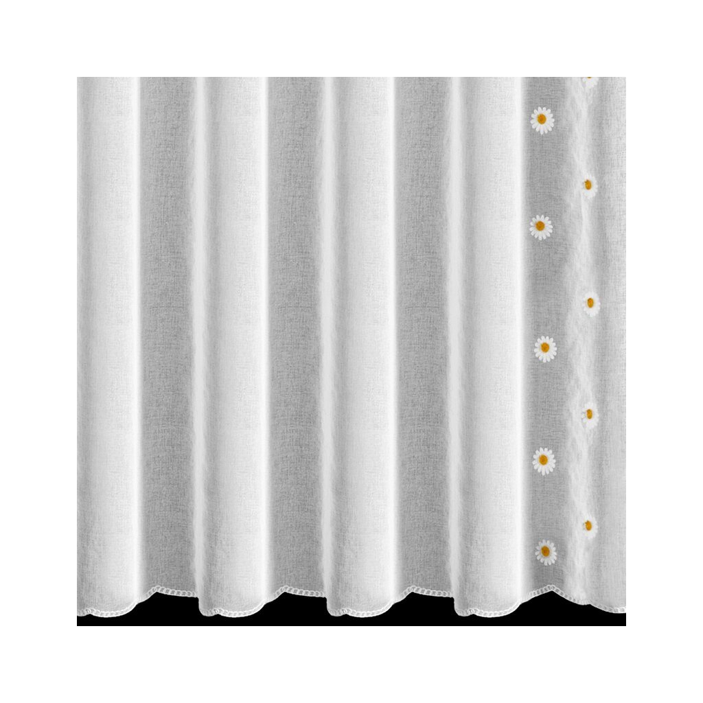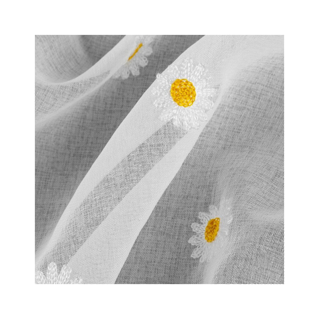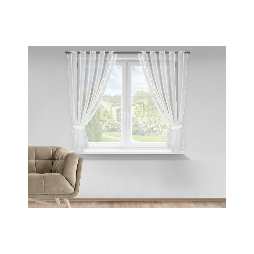 Súprava hotových záclon s výšivkou margarétok a dvomi viazačkami.
