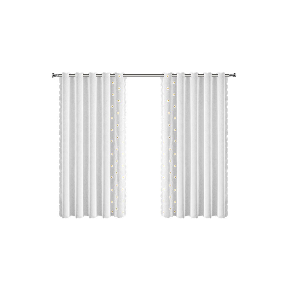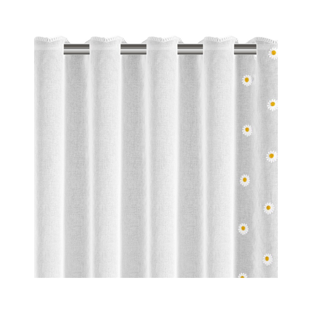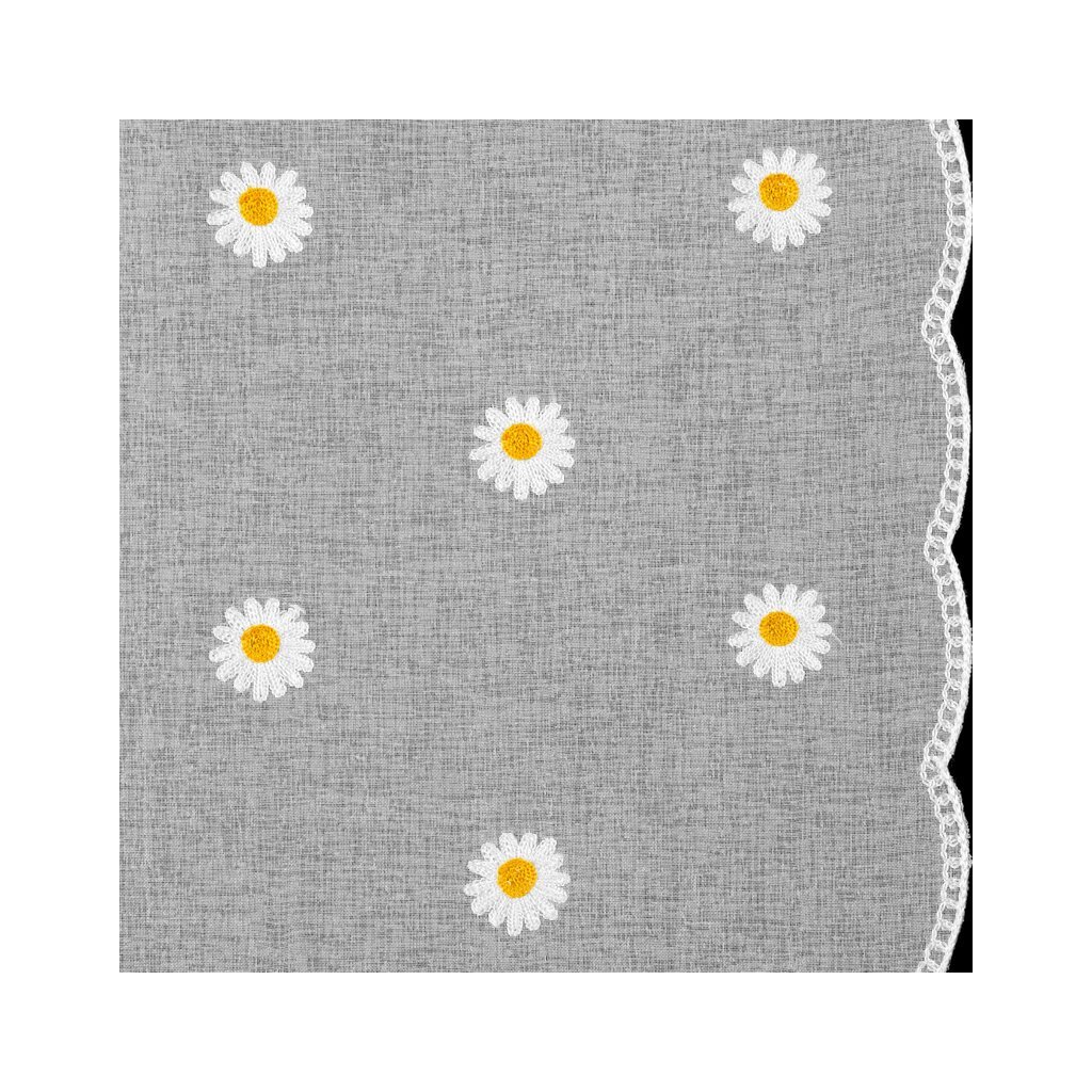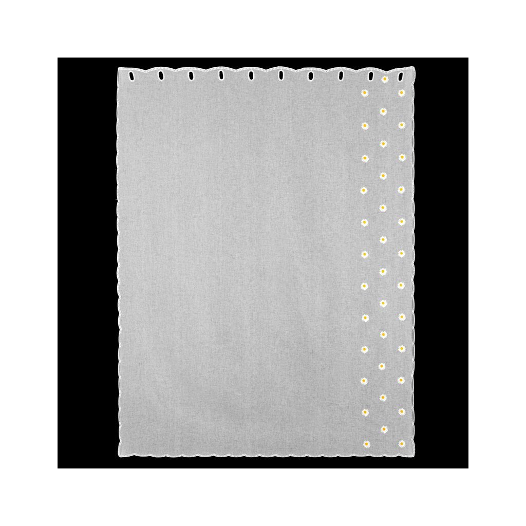Súprava hotových záclon s výšivkou margarétok a dvomi viazačkami.
