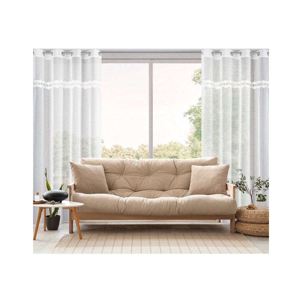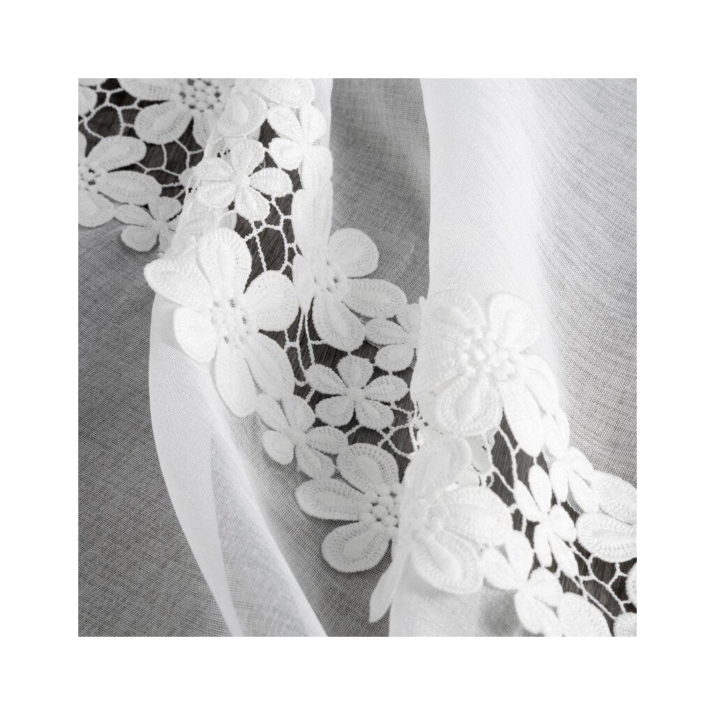 Hotová záclona zdobená lemovaním.
