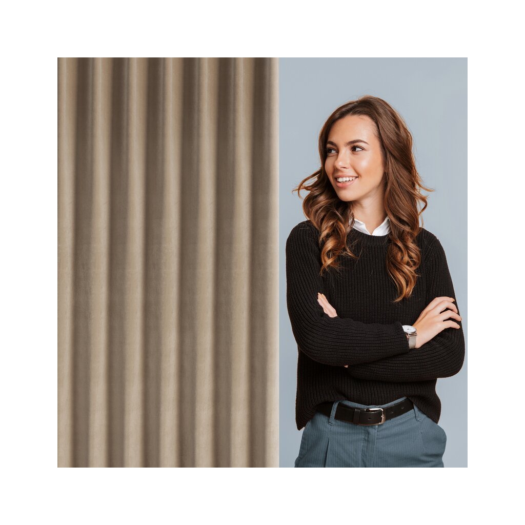 Mäkký zamatový záves s matnou povrchovou úpravou. Hustá tkanina so strednými zatemňovacími vlastnosťami dodá interiéru elegantný charakter.