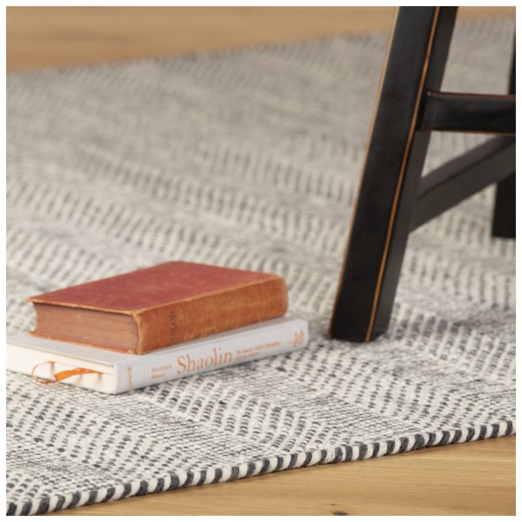 Ručne tkaný vlnený koberec Jaipur, ktorého vzor tvorí tkaná štruktúra v strieborných odtieňoch. Vlna ako prírodný materiál sa vyznačuje dlhou životnosťou a antibakteriálnymi vlastnosťami.