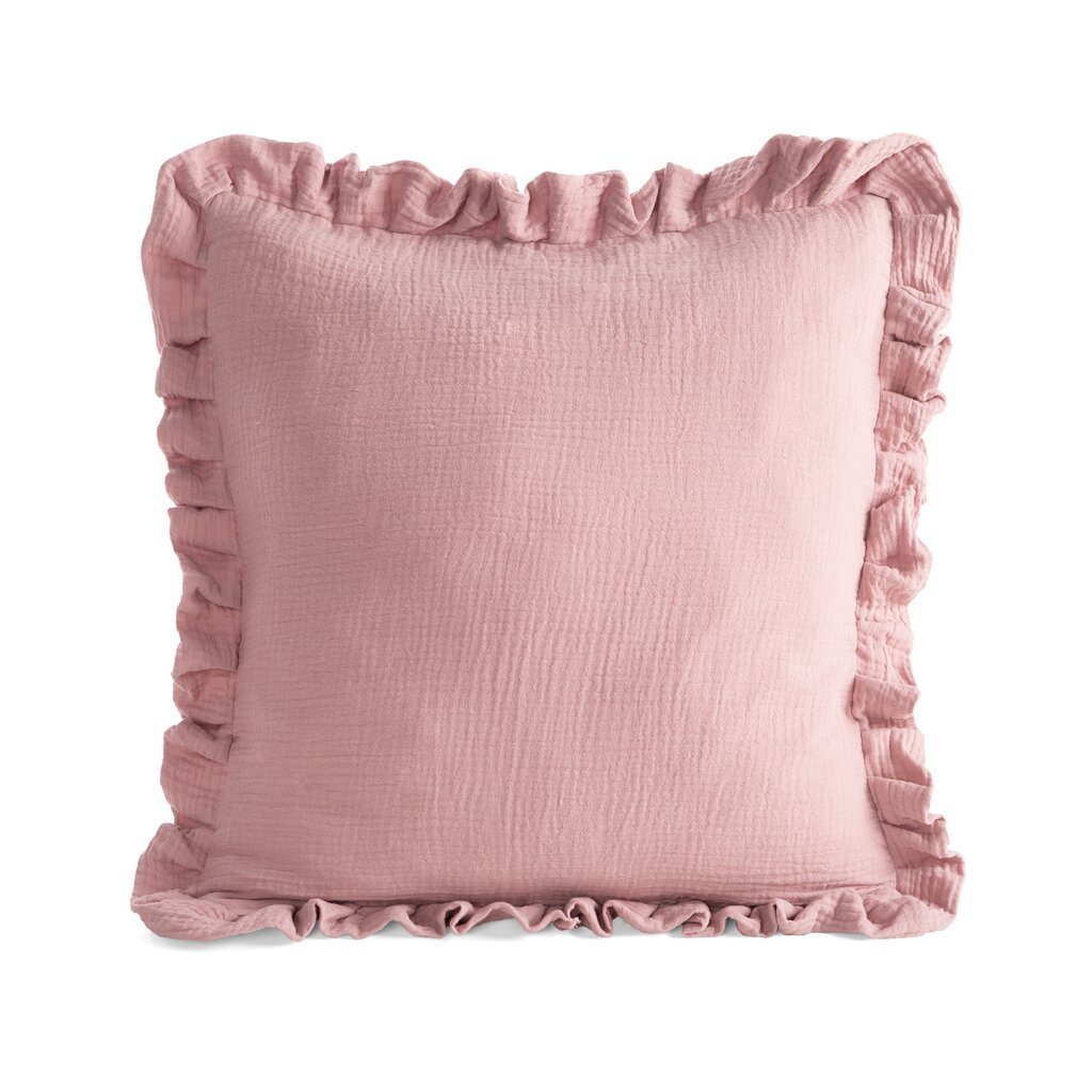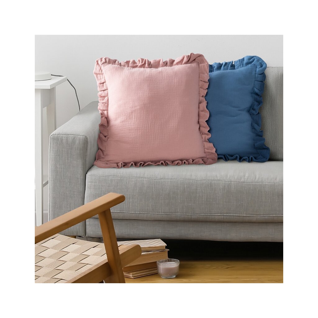 Mušelínová dekoračná obliečka na vankúš lemovaná ozdobným volánom.