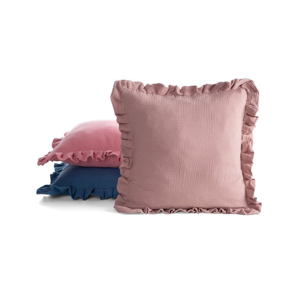 Mušelínová dekoračná obliečka na vankúš lemovaná ozdobným volánom.