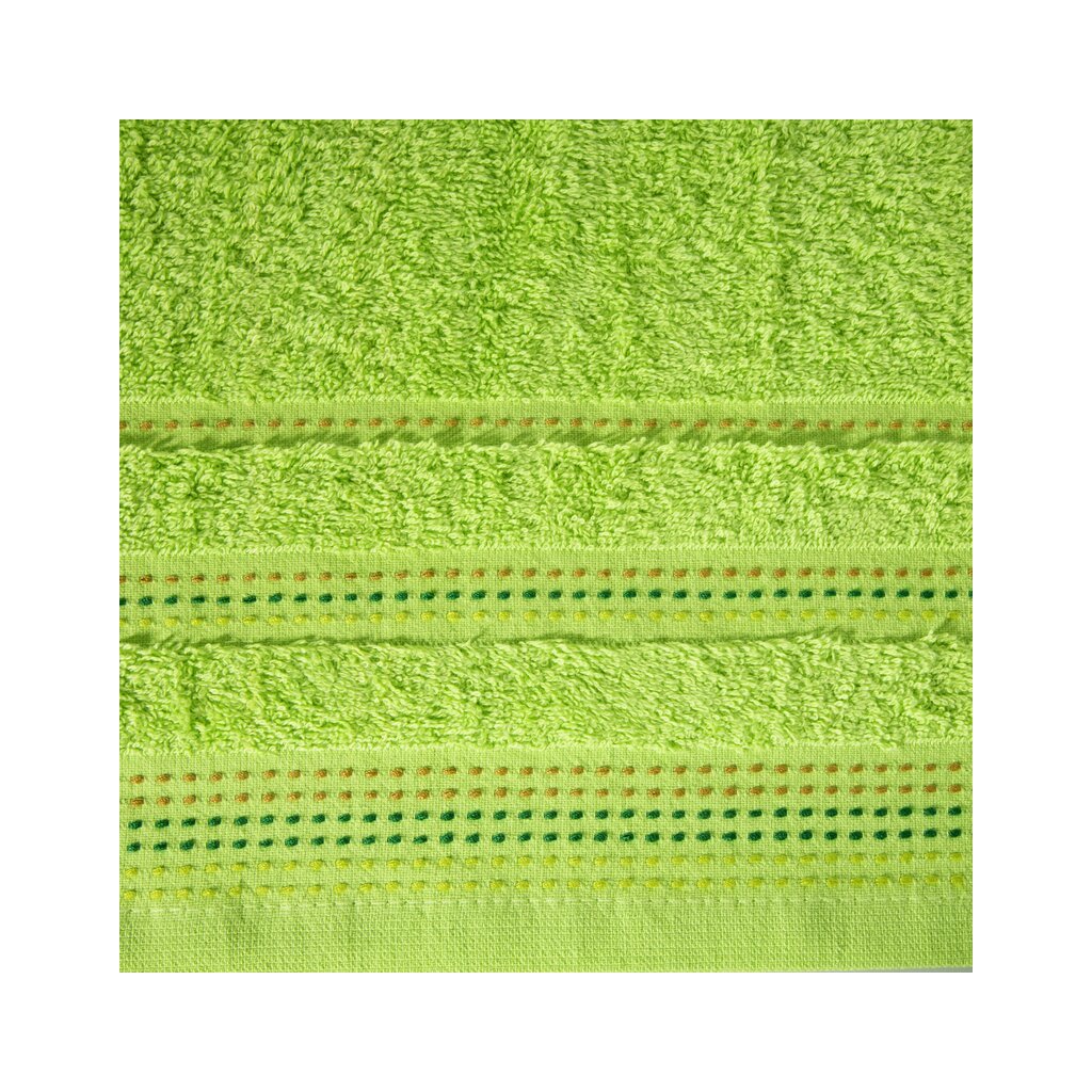 Jednofarebný uterák z mäkkej a savej bavlnenej froté tkaniny, zdobený farebnou bordúrou v štýle stehovania. Ľahko sa perie, nepúšťa farbu.