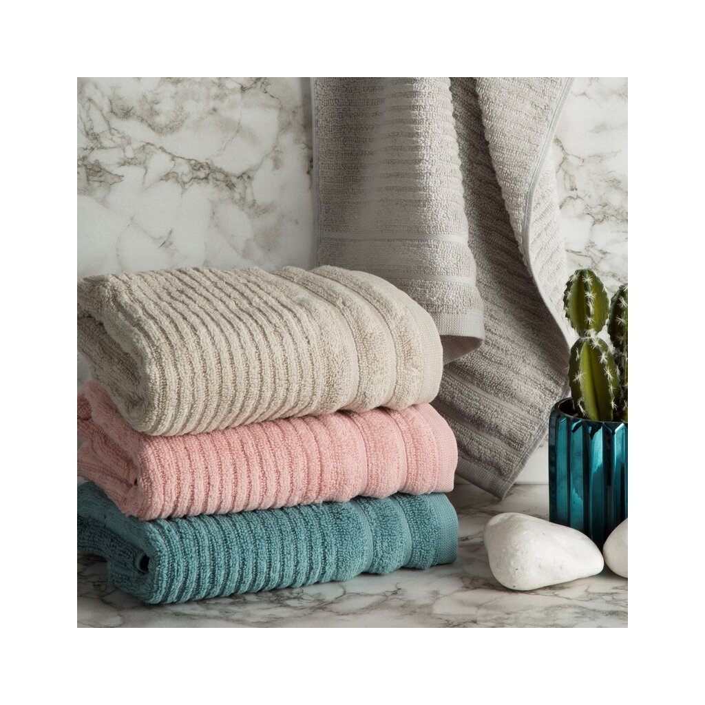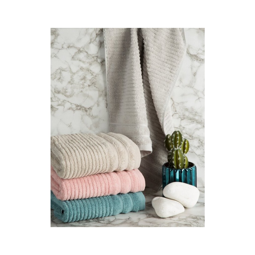 Jednofarebný uterák z mäkkej a savej bavlnenej tkaniny s froté väzbou, zdobený farebnou bordúrou v štýle stehu. Jednoduchý na pranie, nepúšťa farbu.