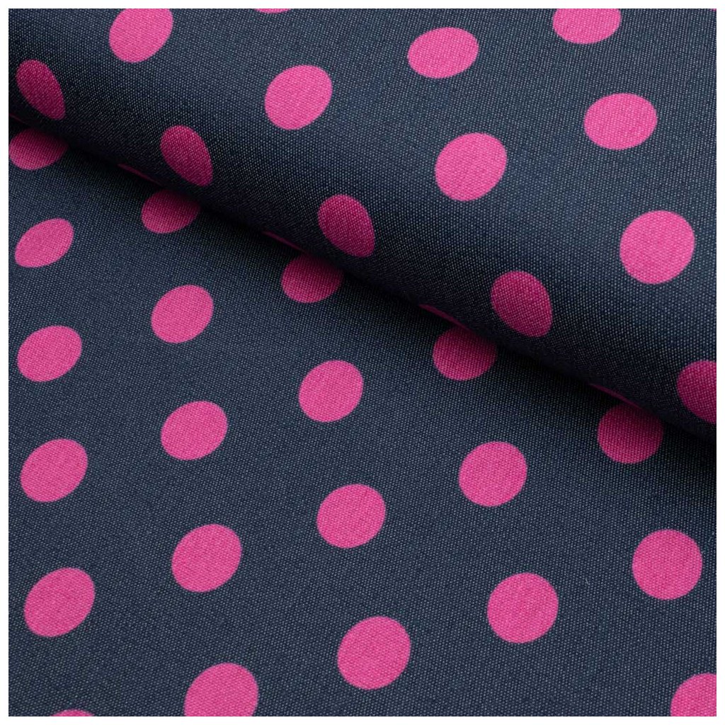 Džínsovina s tradične modrým sfarbením a ružovámi bodkami, so zložením 65% bavlna, 30% polyester a 5% spandex.