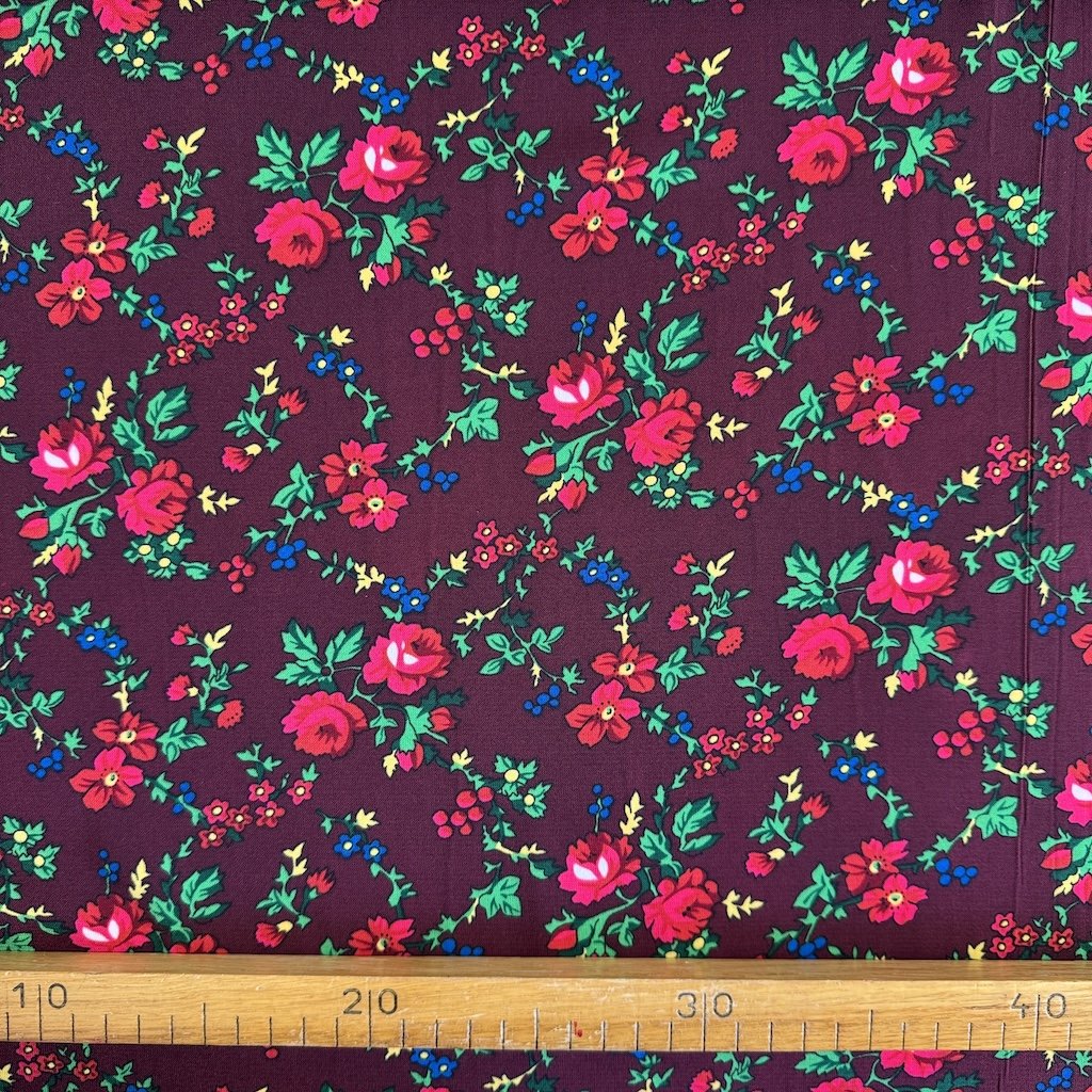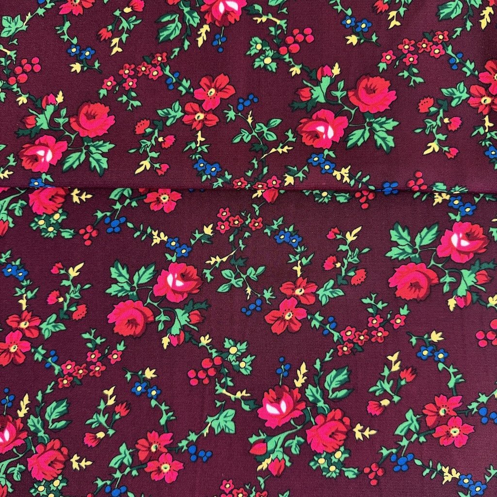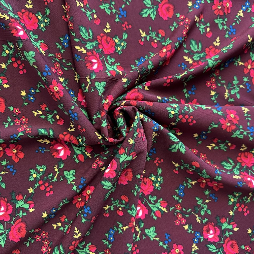 Folklórna látka TIBET ľudový vzor je splývavá, padavá látka, príjemná na dotyk, v rôznych farebných prevedeniach. Látka s potlačou pestrofarebných malých kvietkov, s gramážou 250 g/m2 a so zložením 100% polyester je ideálna na šitie folklórnych odevov a doplnkov.