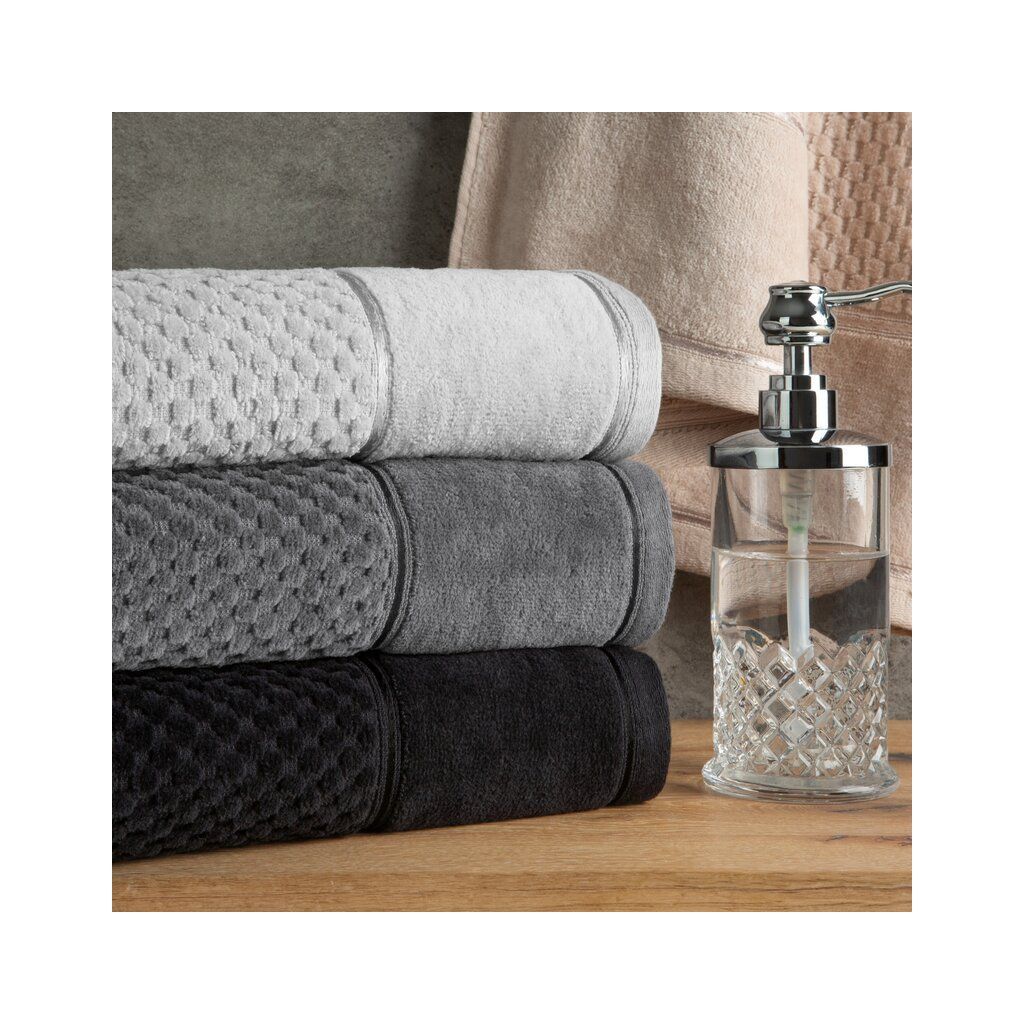 Jednofarebný uterák z mäkkej a savej bavlnenej tkaniny s froté väzbou, zdobený farebnou bordúrou s efektom ručného prešívania. Ľahko sa perie a nepúšťa farbu.