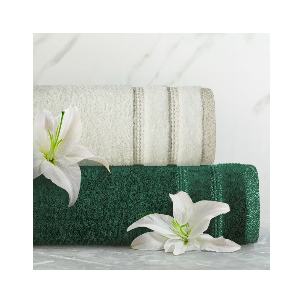 Klasická osuška zo savého bavlneného froté. Minimalistický velúrový lem s lesklou kovovou niťou. šírka: 30 cm, Dĺžka: 50 cm, Farba: oceľ, Hmotnosť: 500 GSM, Zloženie: 100 % bavlna; 99,2 % bavlna 0,8 % kovová niťDodatočné parametre