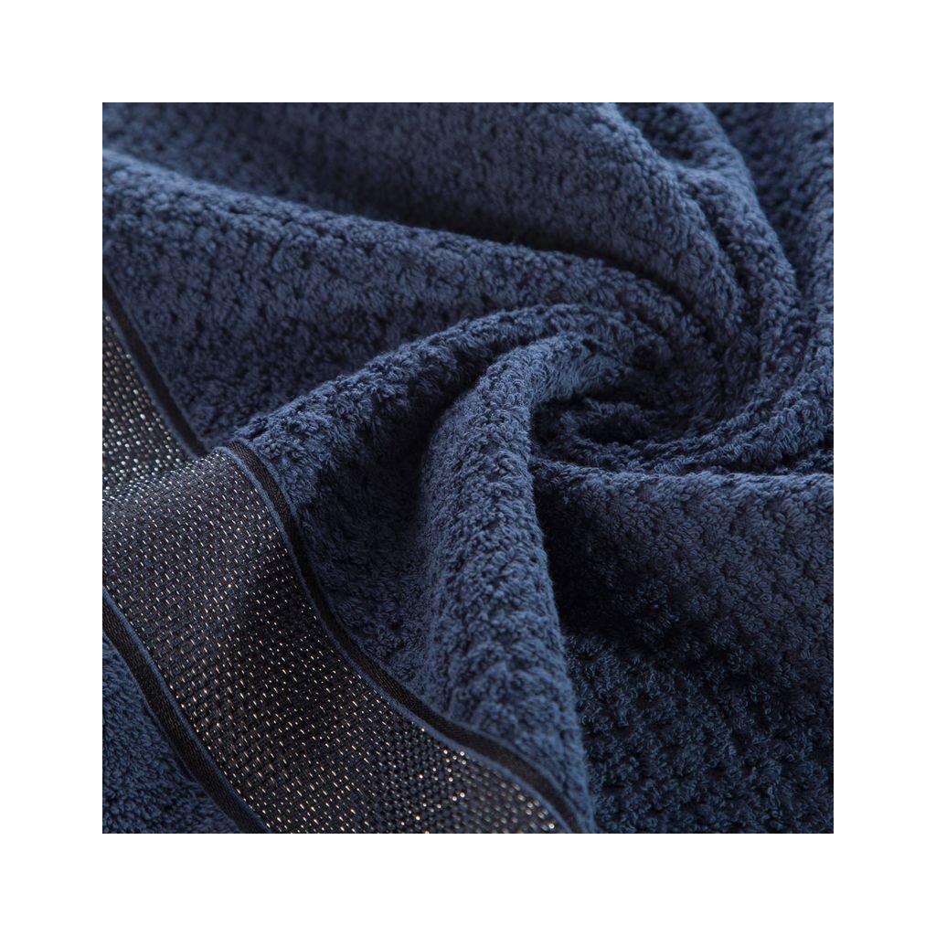 Huňatý uterák s ozdobnými okrajmi pretkanými lesklými niťami Šírka: 30 cm, Dĺžka: 50 cm, Farba: tmavomodrá, Hmotnosť: 500 GSM, Zloženie: 100% bavlna; 85% kovové vlákno 15% polyesterDodatočné parametre