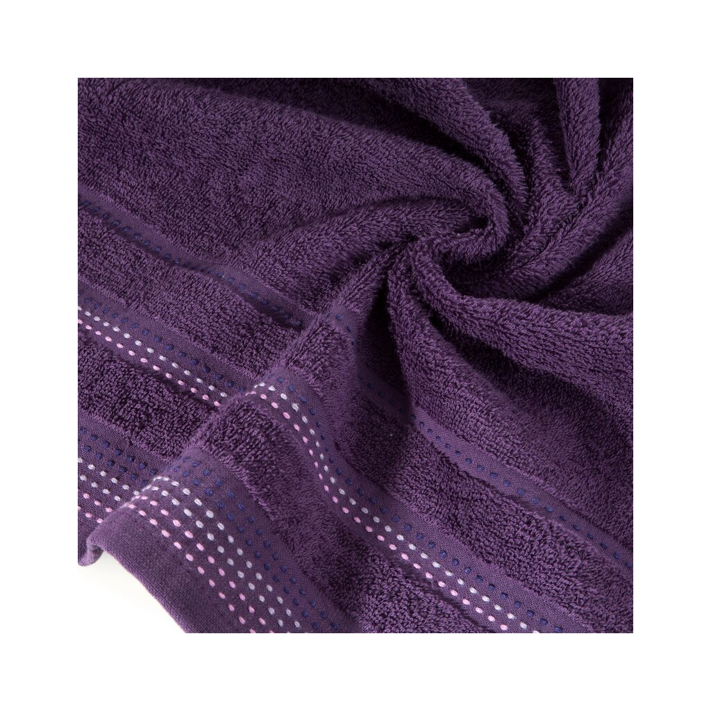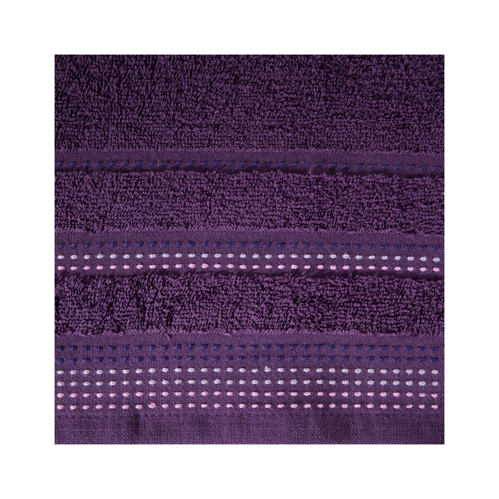 Jednofarebný uterák z mäkkej a savej bavlnenej tkaniny s froté väzbou, zdobený farebnou bordúrou v štýle ozdobného prešívania. Ľahko sa perie, nepúšťa farbu.